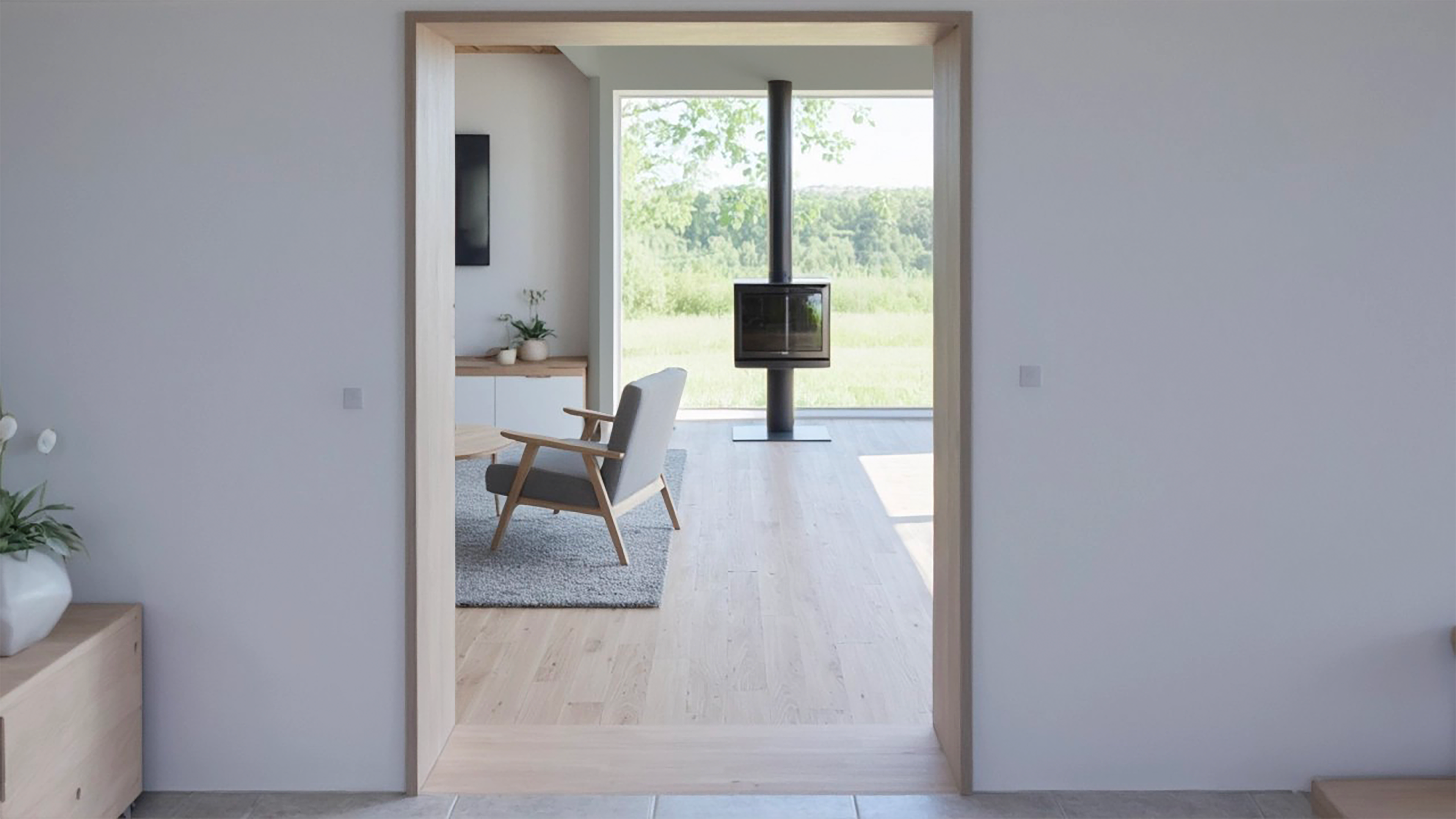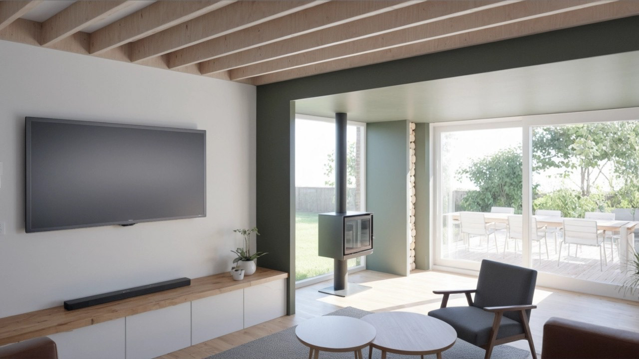 L’extension, implantée à l’arrière et sur le côté de l’habitation, permet la création d’un nouveau séjour largement ouvert sur le jardin. Le séjour et la salle à manger existants sont rénovés, et un claustra en bois est créé entre la salle à manger et la cuisine afin de structurer les espaces tout en conservant des transparences. Les deux petites baies vitrées existantes sont remplacées par un châssis coulissant de grande largeur, renforçant la relation entre l’intérieur et l’extérieur. Le nouveau séjour se distingue par un plafond en gitage bois apparent, du mobilier sur mesure et l’intégration d’une cheminée.